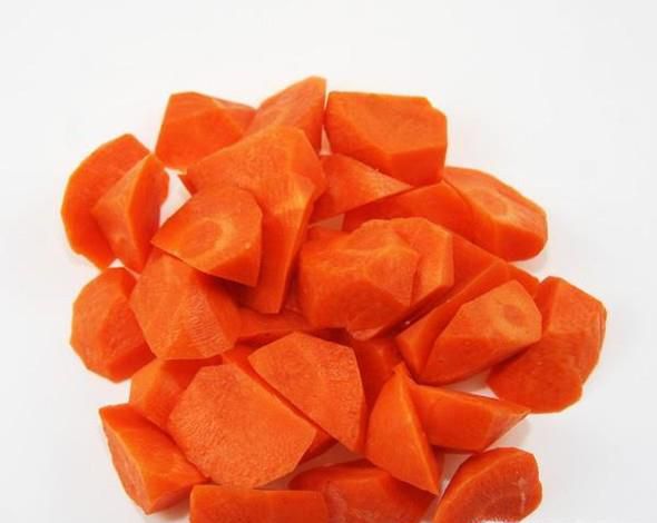 01、胡萝卜用刀刮掉外皮,清洗干净,然后切成小块儿,装盘备用