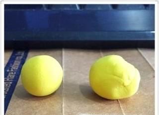 01、第一步,制作皮卡丘的头与身体。选取一块黄色橡皮泥揉捏成两个圆球,一个为圆形,一个为椭圆。