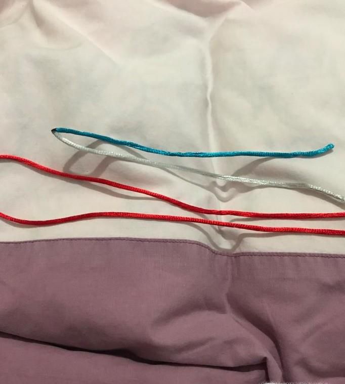 01、剪取两段线,重点在于蓝线和银线,首先将蓝银线放在红线的下面。
