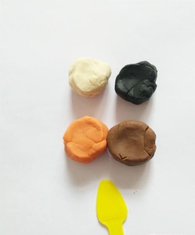 01、准备黑、白、桔、棕四种颜色的彩泥和小刀。