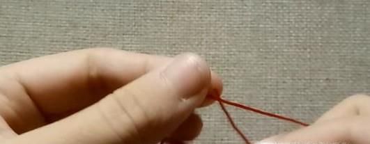 01、首先,一根20cm红线做轴,一根30cm红线在中间部分打斜卷结。如图所示。