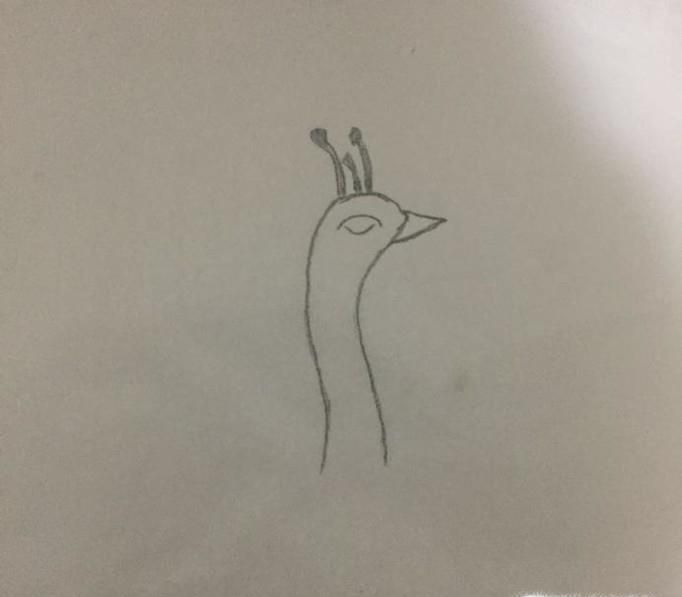 01、首先我们用铅笔在A4纸上画出孔雀的头和脖子,如下图所示。画孔雀头的时候必须要控制好大小,因为孔雀图的大小直接决定了其他部分的大小。