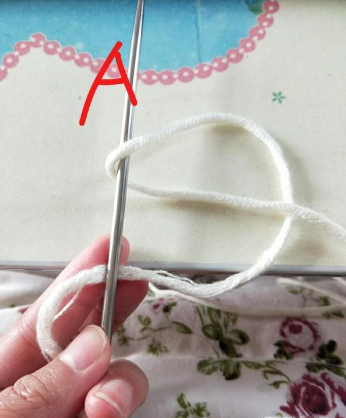 01、起针:左手握住A针,将毛线前端压在A针下,绕过右手拇指和食指,右手无名指顺势钩住毛线