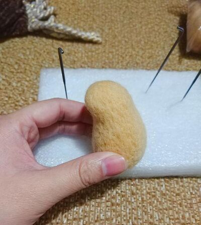 01、用褐色羊毛戳出小老鼠的大体轮廓,在肚子部分用白色羊毛戳出肚皮。