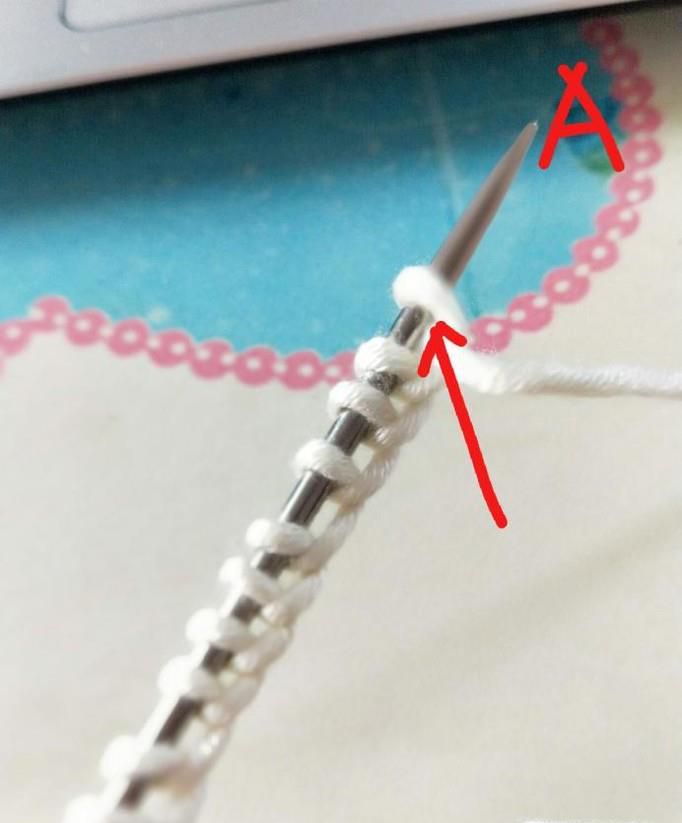 02、右手将毛线从B针下方绕上来并置于A针下方,稍稍拉一下