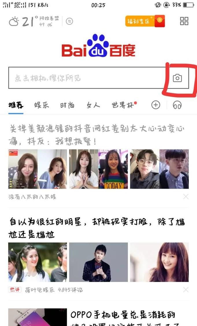 01、进入手机百度过后,点击百度搜索框旁边的拍照符号,进入拍照功能。