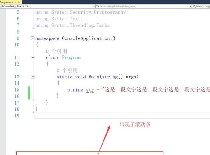 01、首先我们先来看一下没有经过配置的VS在出现过长代码时候是怎么处理的,如下图所示,他会出现横向的滚动条,对于我们平时的开发很不方便
