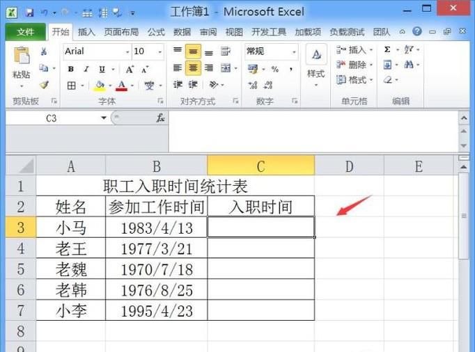 01、首先使用excel将我们需要的计算入职时间的表格文件打开,然后选择单元格,如图所示: