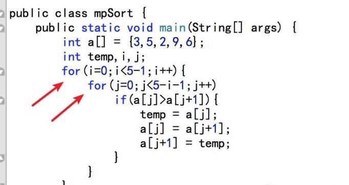 01、首先看一下整体的代码,如图,冒泡排序是通过二层的for循环来实现的。
