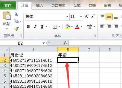 01、首先,打开Excel2010,在表格中录入好包含身份证号码的数据表,接下来点击要放置年龄的单元格。