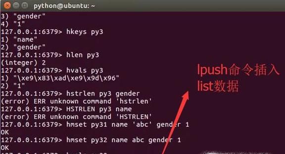 01、首先打开Ubuntu命令行,在命令行中我们可以用lpush命令按从左往右的顺序插入一个list数组,如下图所示